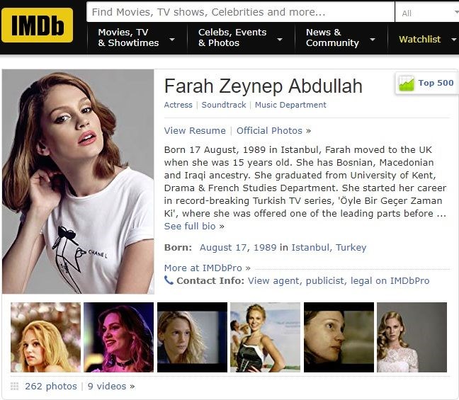 • IMDb, her ay ismi en çok aranan ve forumlarda hakkında en çok konuşulan oyuncuların listesini yayınlıyor. Kullanıcı oylarıyla oluşturulan bu listenin Ağustos 2018 sonuçları yayınlandı. Buna göre Farah Zeynep Abdullah dünya sıralamasında 407’nci oldu.
