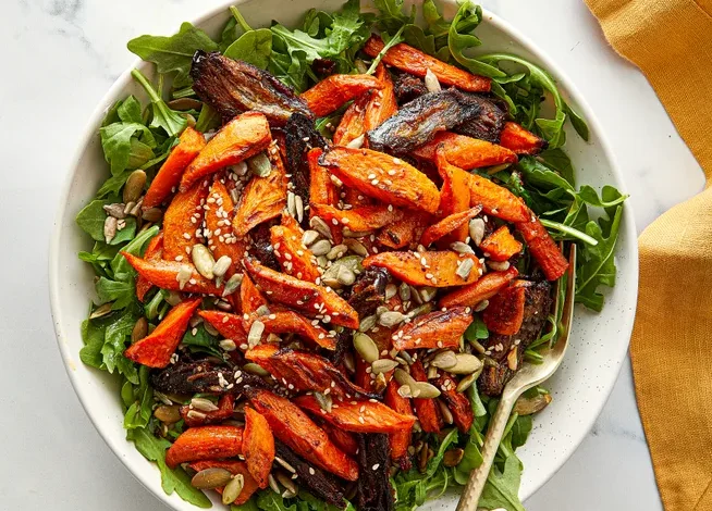 سالاد مراکشی هویج و خرما کبابی با سس عسل ترکیبی بینظیر از سبزیجات شیرین، خرماهای نرم و کاراملی، سبزیهای تازه و دانههای برشته است که با یک سس عسل و سرکه سفید، طعمی گرم، متعادل و کاملاً پاییزی به سفره شما میبخشد.