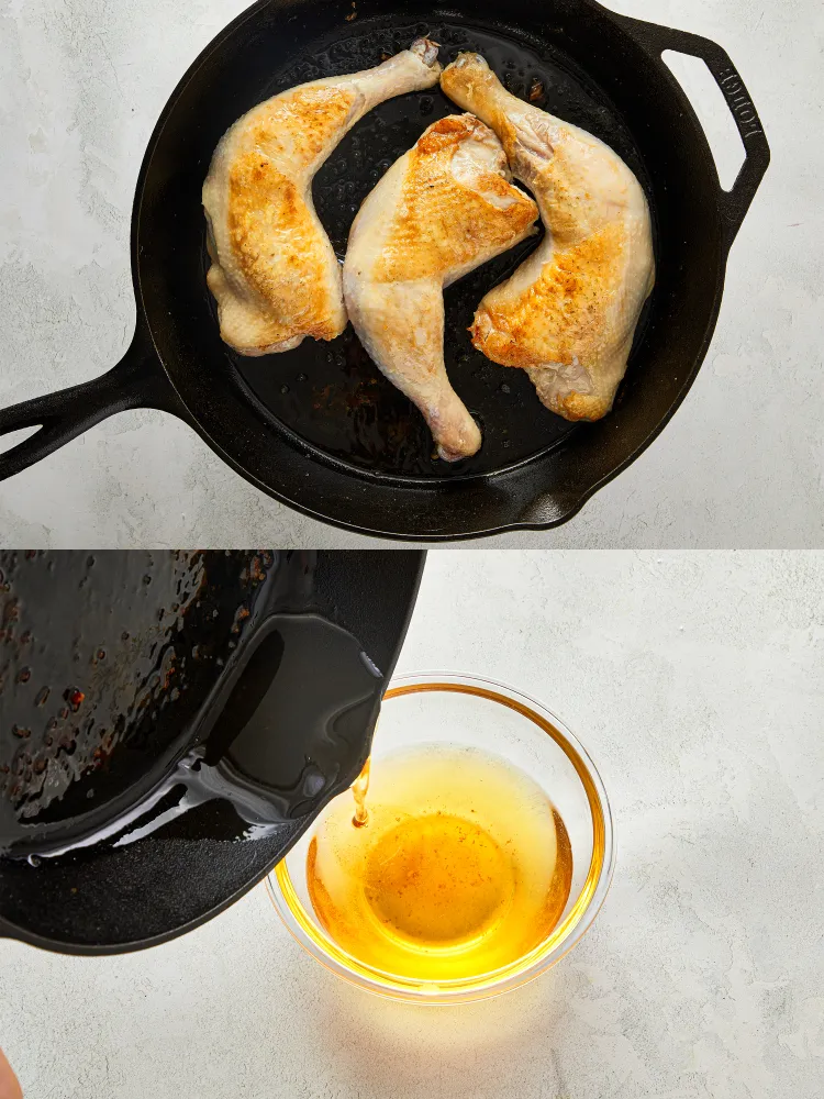 2. ران و ساق مرغ را در تابه با یک قاشق روغن سرخ کنید تا طلایی شود، سپس چربی آن را به چربی جمع‌شده اضافه کنید.