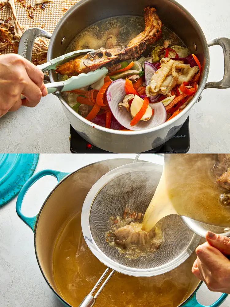 4. ضایعات سبزیجات، سیر و استخوان‌های مرغ را اضافه کنید و 1.5 تا 2 ساعت بجوشانید تا آب مرغ طلایی و خوش‌طعم شود. صاف کرده و کنار بگذارید.
