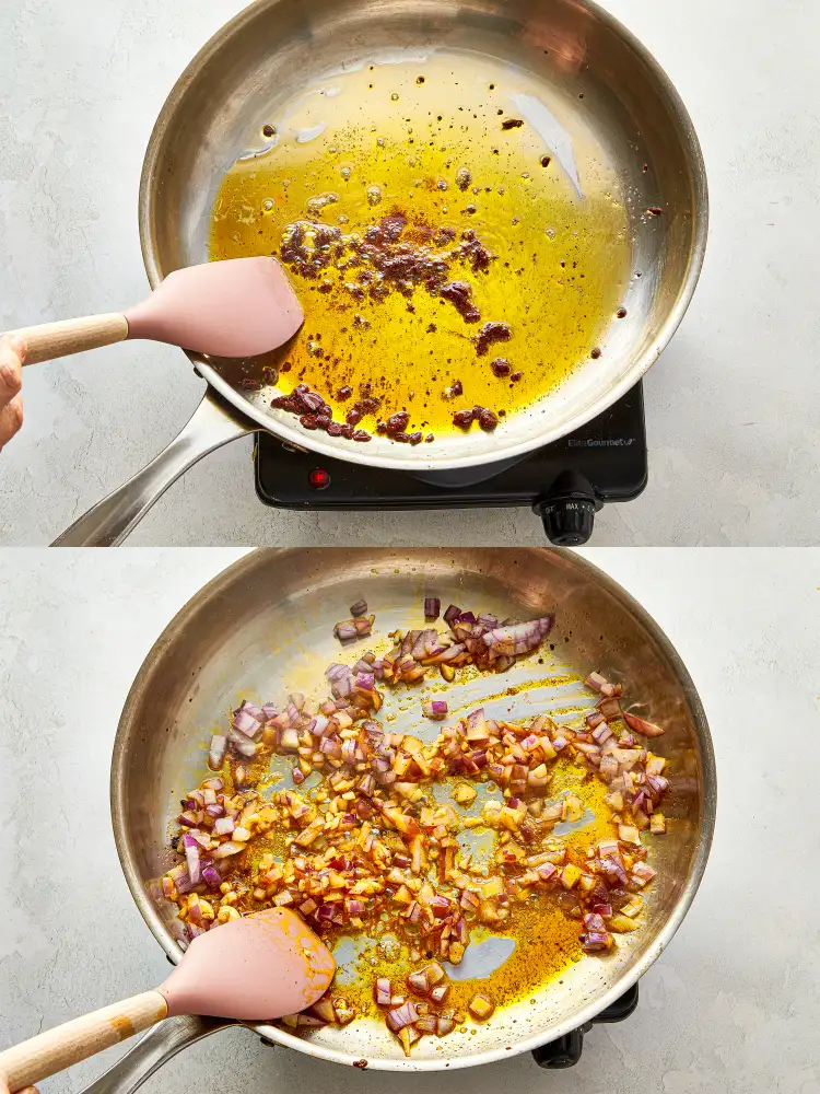 2. دانه‌های آناتو را جدا کرده، پیاز، سیر، نمک و فلفل را اضافه کنید و تا طلایی شدن تفت دهید.