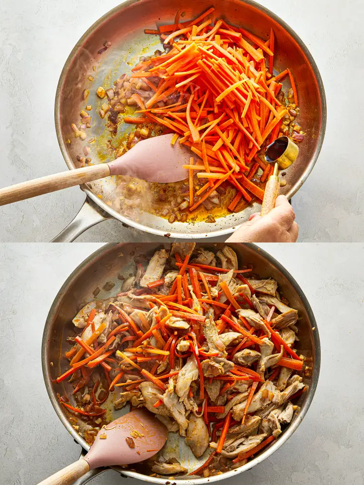 3. هویج و 2 قاشق غذاخوری سس ماهی را افزوده، 3 تا 4 دقیقه بپزید، سپس مرغ ریش‌ریش را اضافه کرده و مخلوط کنید.