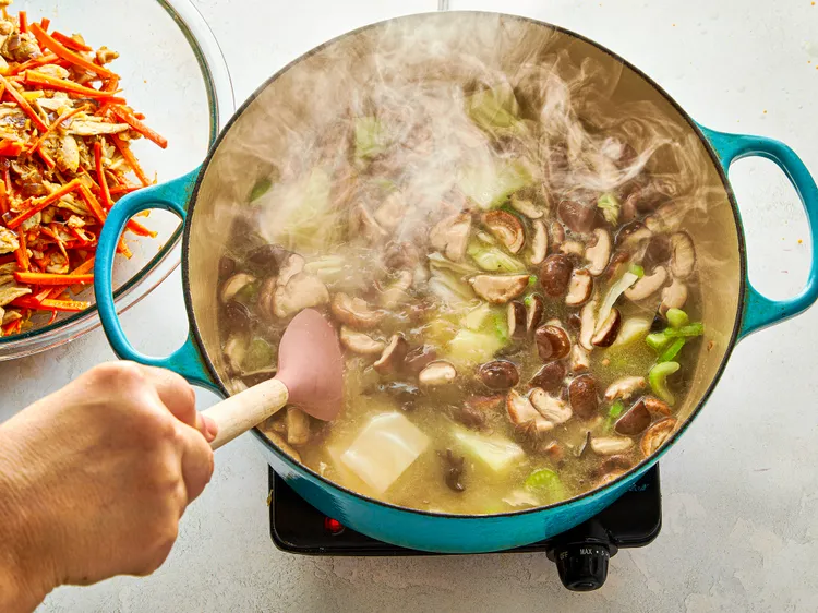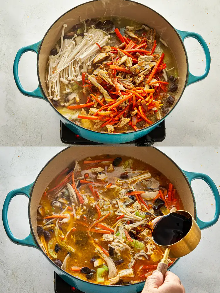 آب مرغ را بجوشانید، قارچ شیتاکه، قارچ گوش‌چوبی، کرفس و کلم را اضافه کنید و 10 تا 15 دقیقه بپزید. سپس قارچ انوکی و مخلوط مرغ و هویج را اضافه کرده و باقیمانده سس ماهی و نمک را به ذائقه تنظیم کنید.