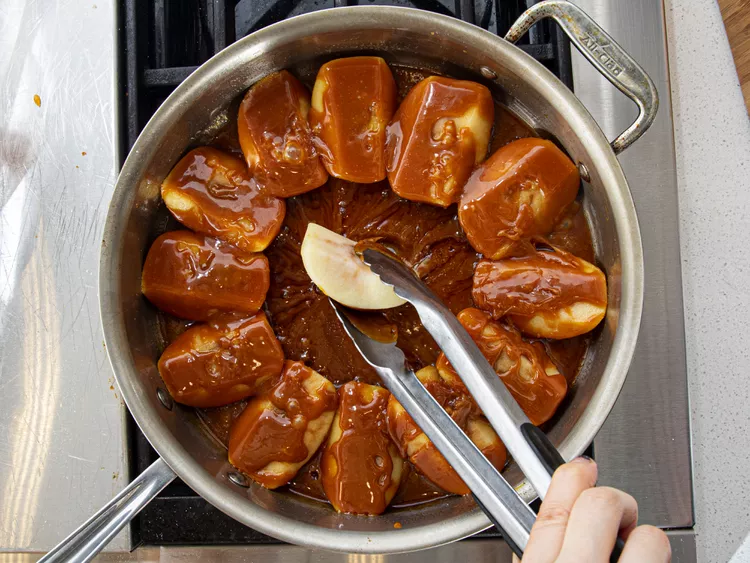 با انبر، هر تکه سیب را در کارامل بغلتانید و بهصورت دایرهای در کف ماهیتابه بچینید (روی قسمت گرد رو به پایین). حلقه دوم سیبها را روی اول قرار دهید و مرکز را با سیبهای کاراملی پر کنید. کمی فشار دهید تا لایههای پایین با کارامل تماس داشته باشند. روی حرارت ملایم 5 دقیقه بپزید تا کمی نرم شوند.
