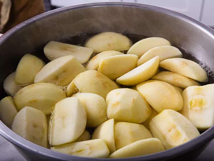 - خیساندن سیبها با آب داغ قبل از پخت، پکتین را پایدار کرده و مانع از لهشدن میوه میشود.