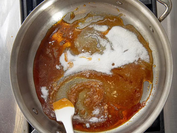 در ماهیتابه 25 سانتیمتری، نصف شکر را روی حرارت متوسط ذوب کنید تا کاراملی شود. باقیمانده شکر را اضافه و هم بزنید تا همه ذوب شود و رنگ کهربایی پیدا کند. کره، وانیل و باقی سرکه سیب را اضافه کنید و هم بزنید تا کارامل به رنگ بِلاندی (butterscotch) برسد.