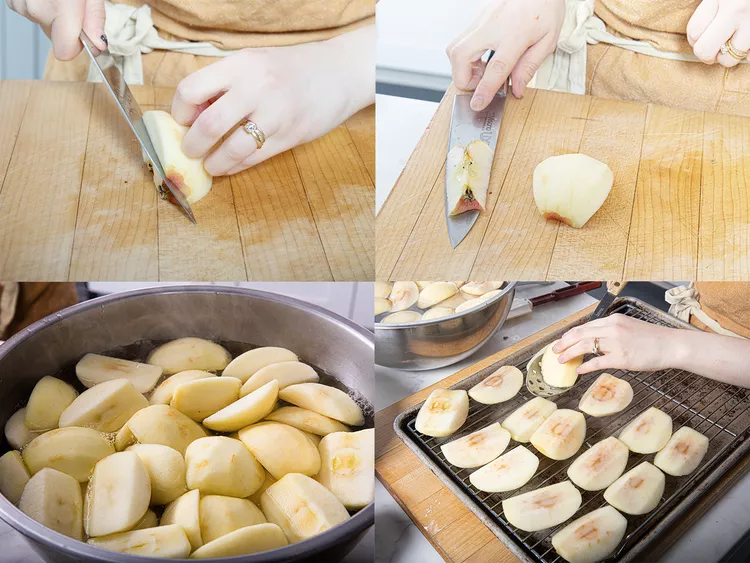 سیبها را پوست گرفته، هستهگیری و چهارقسمت کنید. در کاسه بزرگ با 1.5 قاشق چایخوری سرکه سیب مخلوط کنید. آب جوش را روی سیبها بریزید و 10 دقیقه بگذارید بمانند. سپس روی توری و سینی پخش کنید تا 10 دقیقه خنک و خشک شوند.