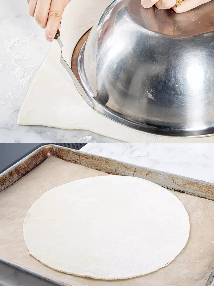 در سطح آردپاشیشده، خمیر را به دایرهای با قطر حدود 28 سانتیمتر باز کنید. با چنگال سوراخهای ریز بزنید، روی کاغذ روغنی در سینی قرار داده و پلاستیک بکشید. در یخچال بگذارید تا زمان استفاده سرد بماند.